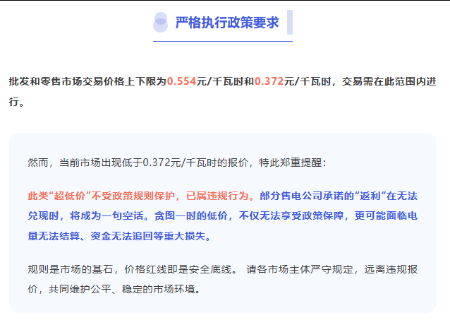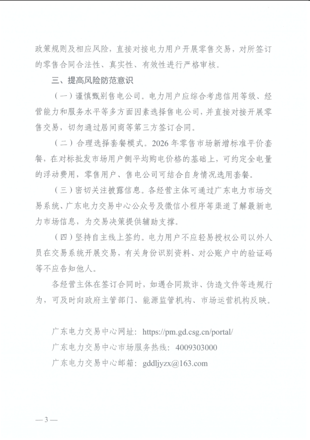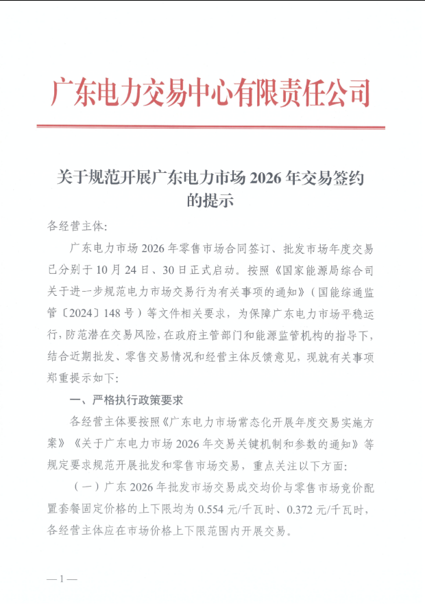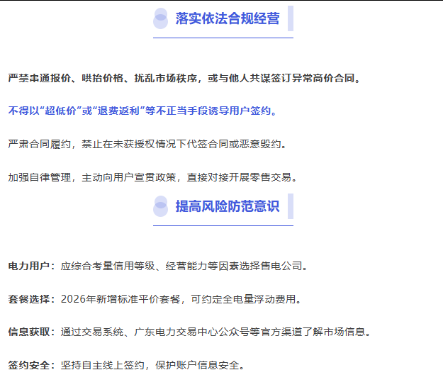 广东电力市场2026年零售和批发市场交易已正式启动超半个月,针对目前市场上普遍存在的低于政策规定的最低限价报价抢单的不规范行为,广东电力交易中心近日发布重要提示,就交易签约有关事项向各经营主体作出规范指引: