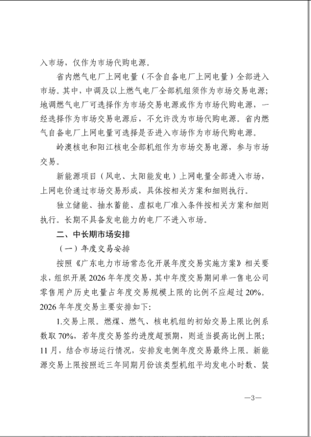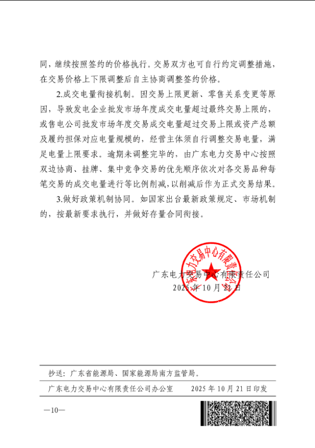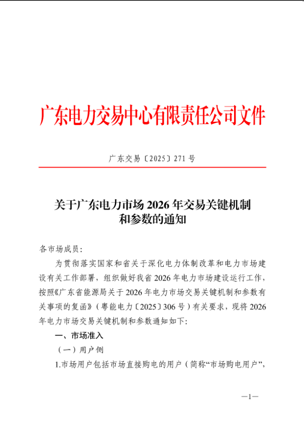10月21日,广东电力交易中心发布《关于广东电力市场2026年交易关键机制和参数的通知》(广东交易〔2025〕271号,以下简称《通知》),该文件明确了市场准入、中长期交易、现货市场、零售套餐、风险管控等关键机制,为各类市场主体开展2026年电力交易提供了系统性指引。