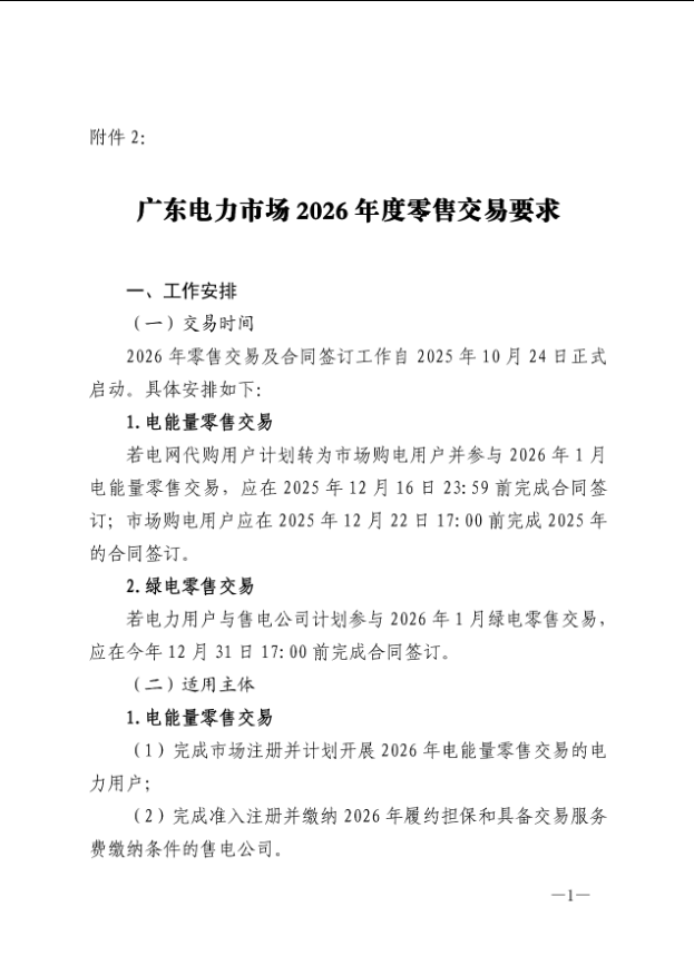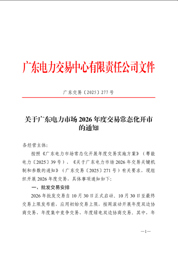 广东电力交易中心于10月22日发布《关于广东电力市场2026年度交易常态化开市的通知》(广东交易〔2025〕277 号),2026年度电力交易即将正式启动。